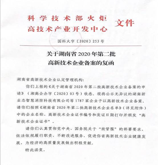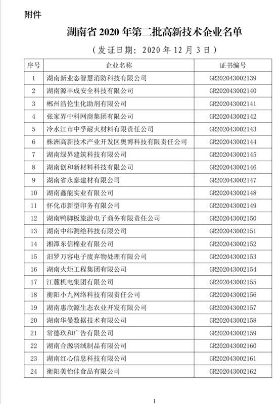 近日,根據全國高新技術企業認定管理工作領導小組公示的《關于湖南省2020年第二批高新技術企業備案的復函》(國科火字〔2020〕253號),湖南省2020年第二批高新技術企業名單出爐,株洲市中建新材料有限公司獲得認定。證書編號:GR202043002913。