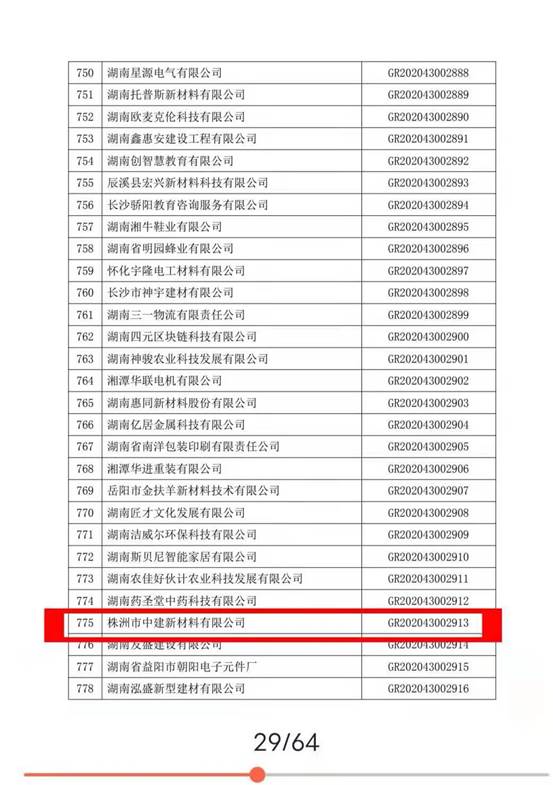 株洲市中建新材料通過高新技術企業認定的公告